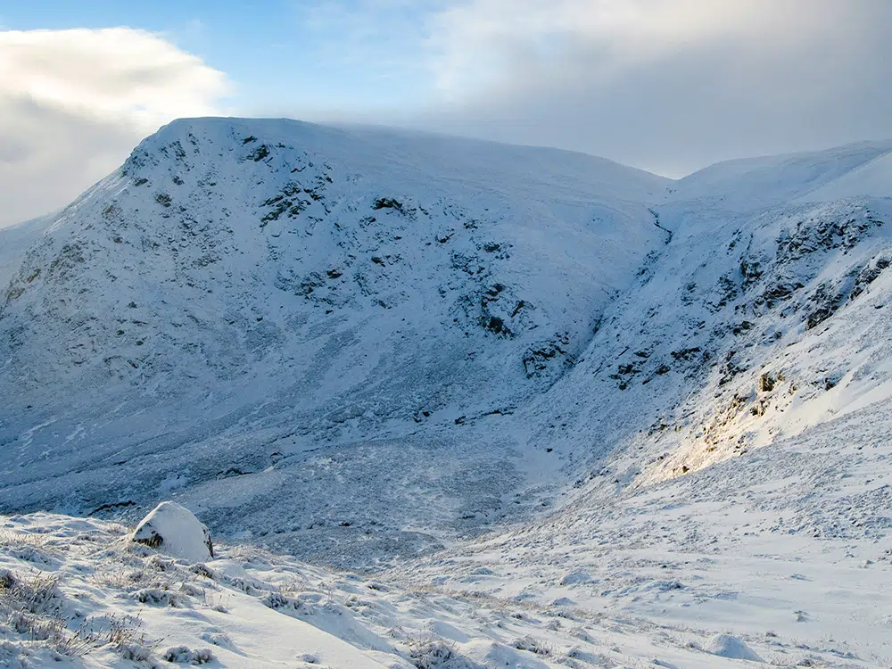 Dwie rozległe góry na samym końcu Glen Doll, Mayar i Driesh, to klasyk zimowych wędrówek w Szkocji. Trasa, nie przedstawia technicznych trudności, prowadzi po dobrze wydeptanych ścieżkach a orientacja w terenie najczęściej nie stanowi wyzwania. Te dwa niewysokie szczyty w paśmie Południowych Cairngorm’sów, naszym zdaniem, oferują dużo lepsze doświadczenie zimą niż latem. Latem ścieżki są dość błotniste, natomiast zimowe temperatury rozwiazują ten problem doskonale i idzie się całkiem przyjemnie.